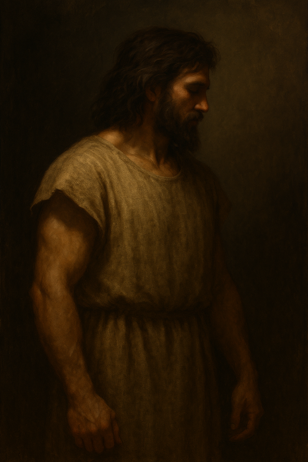 Высокий, мощный. Под два метра ростом. На нём простая тога, как у пастуха — грубая, будто из мешковины.